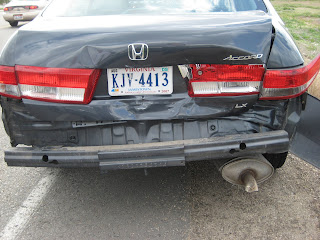 1. I was hit from behind when I was stopped in traffic a few weeks ago. Plenty of damage to my car, but fortunately not too much damage to me. I was hit hard enough that my sunglasses went flying off my face and my chest hit the steering wheel, but thankfully because of my seat belt, there was no other damage. I have been having some back problems, but currently I'm getting help from a chiropractor and a physical therapist to restore some nerve damage that I have. Nothing that can't be fixed in a few weeks.